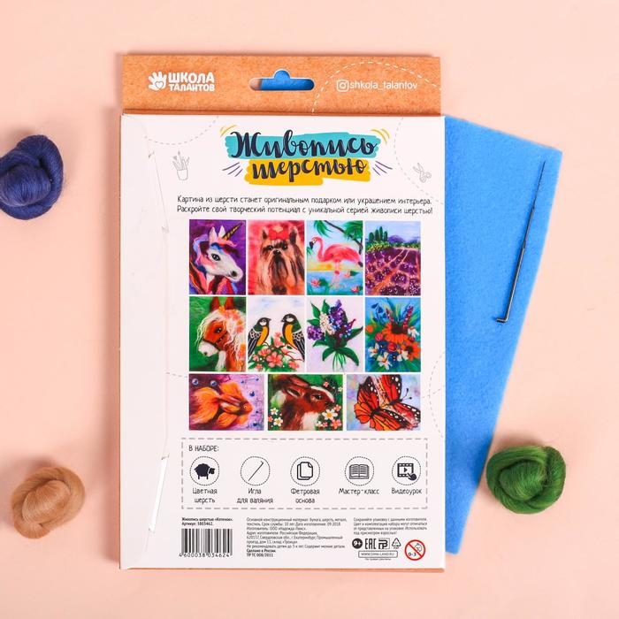 Данный вид творчества основан на валянии. Никогда не слышали о такой технике? Это не проблема: создать мягкое и пушистое панно вам помогут подробные инструкции и видео-мастер-класс, входящие в набор.