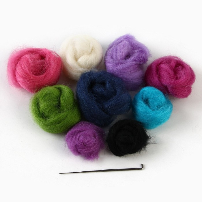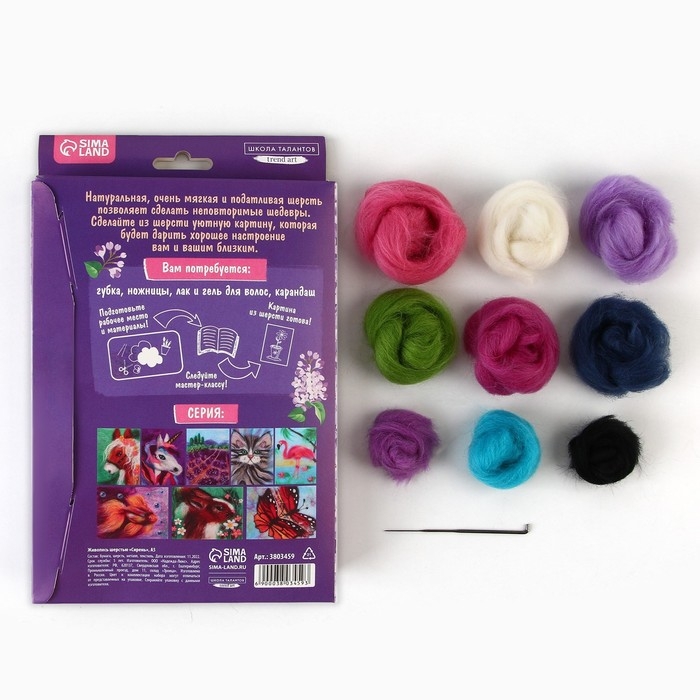 В комплекте вы найдёте лоскуты цветной шерсти, специальную иглу и лист фетра, который будет служить холстом для вашей картины. Дополнительно вам понадобятся ножницы, губка или кусок поролона и немного воды для смачивания пальцев во время работы.
