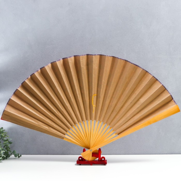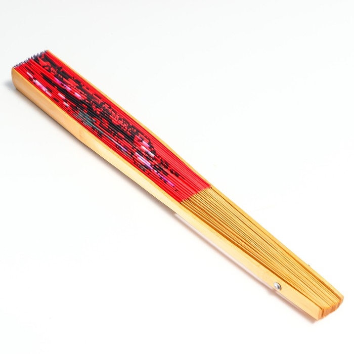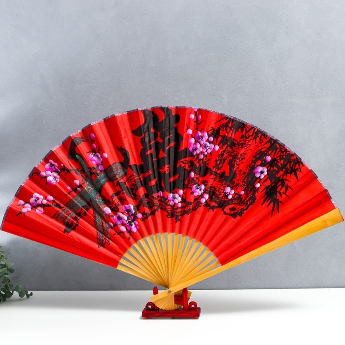 Веер бамбук, текстиль h=50 см "Сакура с птицами" красный