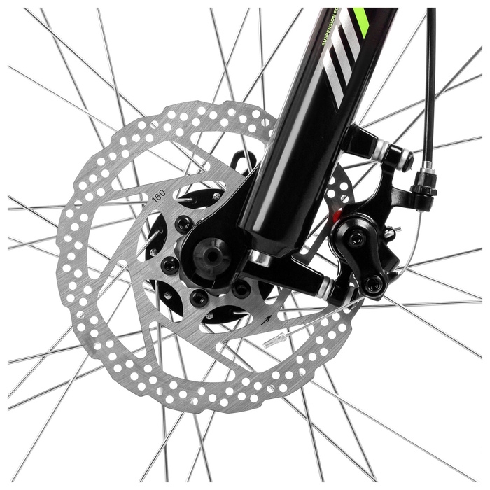 Горный велосипед подходит для передвижения по улицам города и бездорожью. Изделие оснащено дисковыми тормозами, которые обеспечивают надёжное и безопасное торможение в любых условиях. На передней части велосипеда есть амортизационная вилка для комфортной езды по неровной дороге.