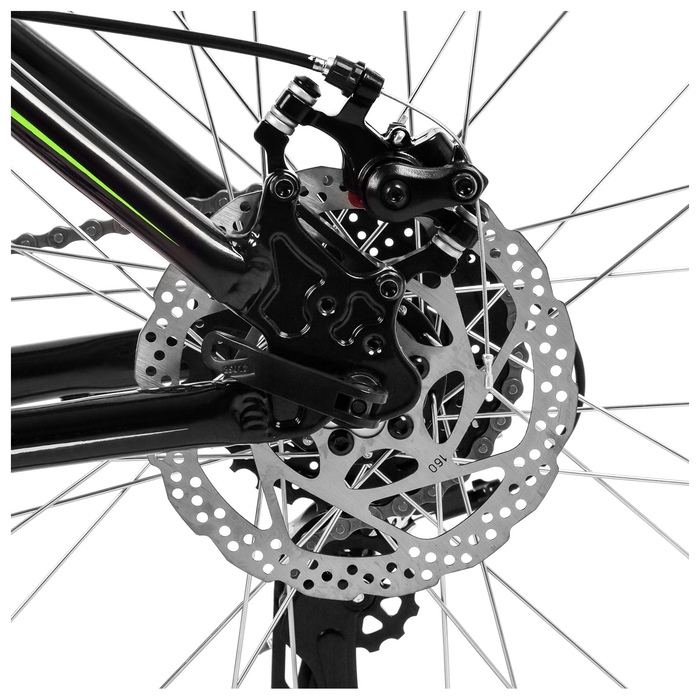 Горный велосипед подходит для передвижения по улицам города и бездорожью. Изделие оснащено дисковыми тормозами, которые обеспечивают надёжное и безопасное торможение в любых условиях. На передней части велосипеда есть амортизационная вилка для комфортной езды по неровной дороге.