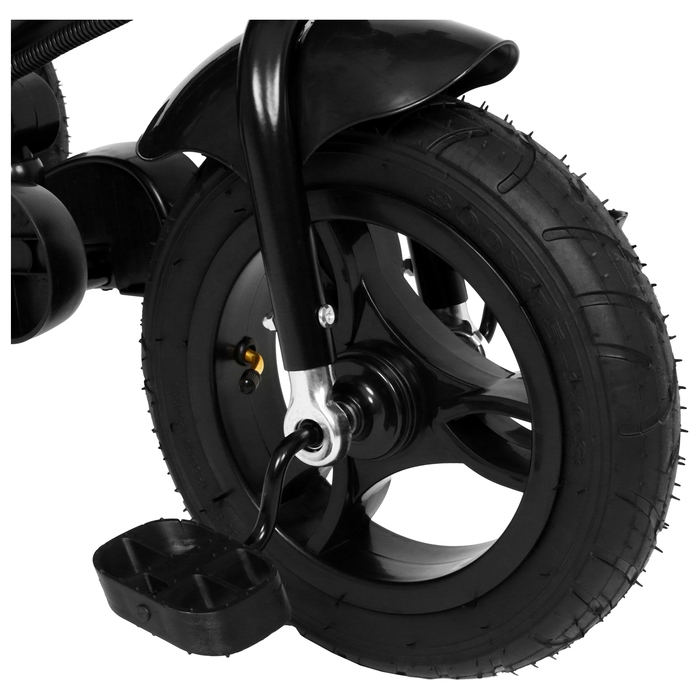 - Надувные резиновые колёса с протектором смягчают ход и обеспечивают сцепление с дорогой.