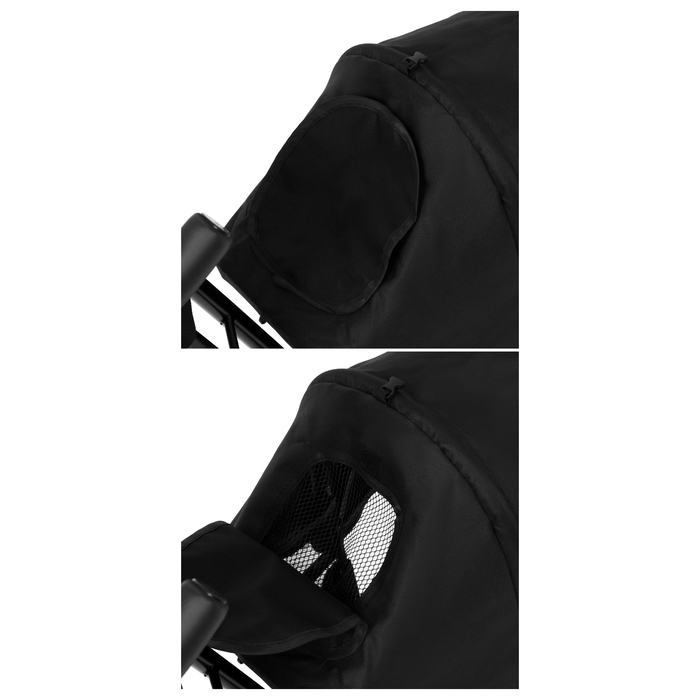- Откидывающийся козырёк защищает от солнца и дождя.