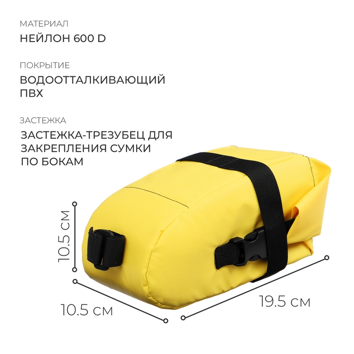 Велосумка Dream Bike — удобный аксессуар для хранения необходимых вещей при катании на велосипеде. Технология roll-top позволяет надежно и плотно закрыть изделие, скрутив ткань несколько раз и зафиксировав её к боковым стенкам. Внутри сумки есть одно отделение с карманом-сеткой для мелких вещей. Изделие легко и быстро крепится под седло при помощи строп с лентой-липучкой.