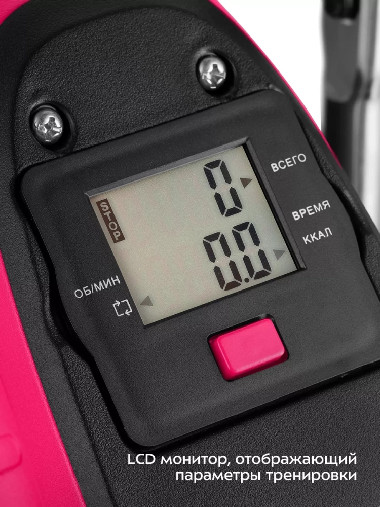 Велотренажер оснащен монитором, на котором отображаются параметры тренировки: длительность тренировки, количество оборотов педалей в минуту, суммарное количество оборотов педалей и количество потребленных калорий. Это позволит вам контролировать нагрузку во время тренировки и ее длительность согласно вашему желанию.