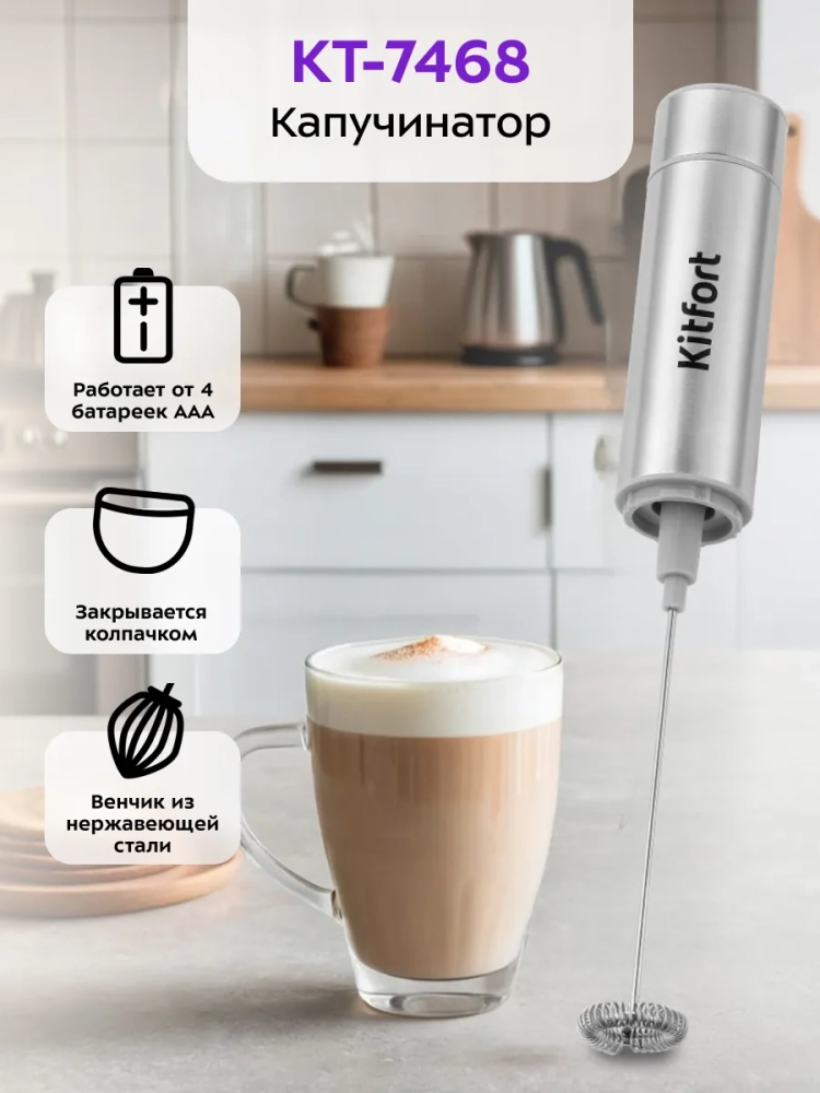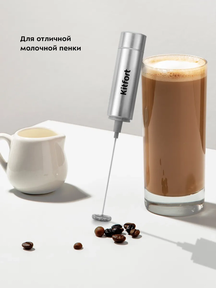 Венчик для взбивания Kitfort КТ-7468 предназначен для вспенивания молока. Внутри венчика есть маленький моторчик, который работает от 2 батареек типоразмера AA (батарейки в комплект не входят). Заряда батареек хватит на длительное время эксплуатации устройства. Пользоваться прибором очень просто: налейте молоко в кружку, поместите в нее венчик и нажмите на кнопку включения.