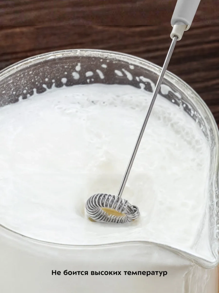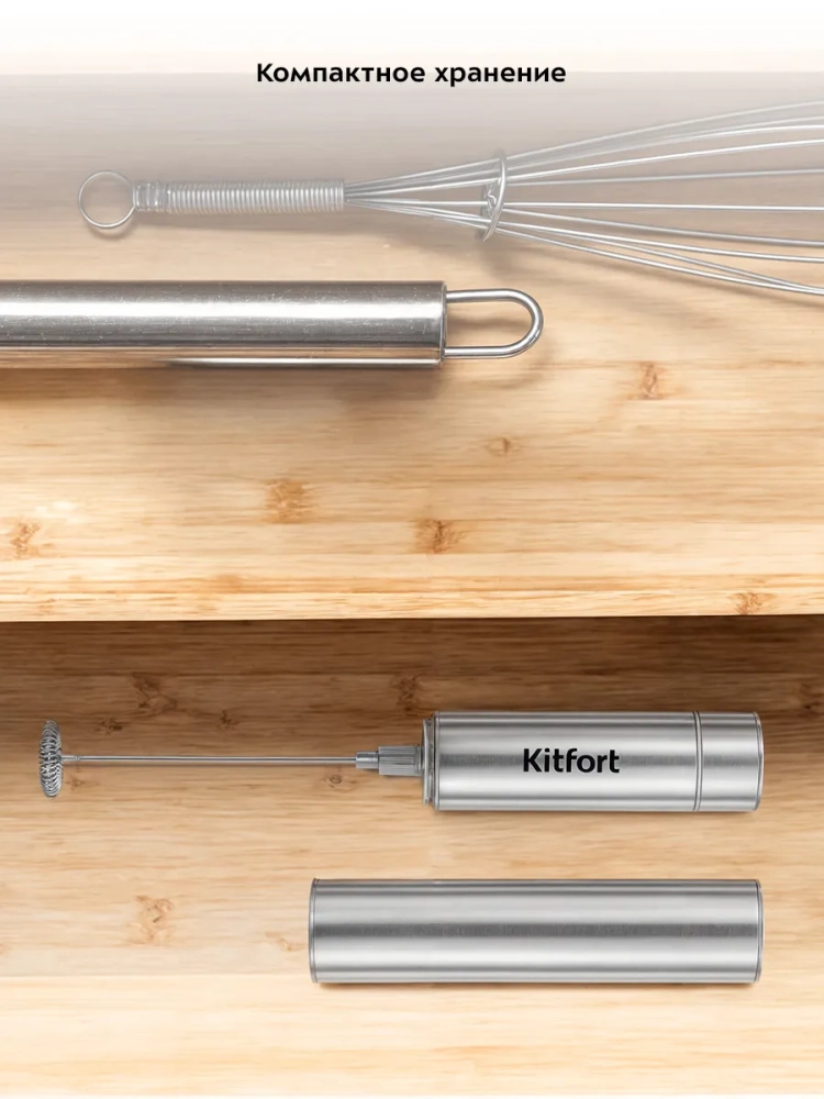 Венчик для взбивания занимает очень мало места и удобен в использовании. Также в комплекте есть подставка для хранения.