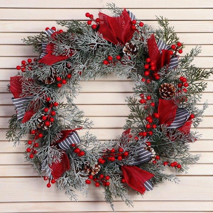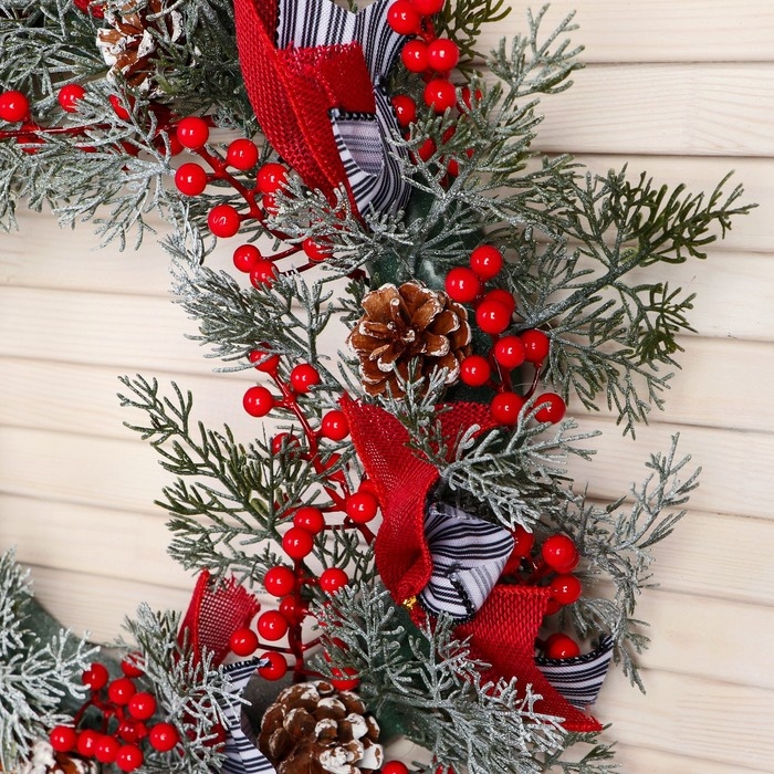 Венок новогодний d- 32 см "Уютная сказка" полосатые ленты шишки