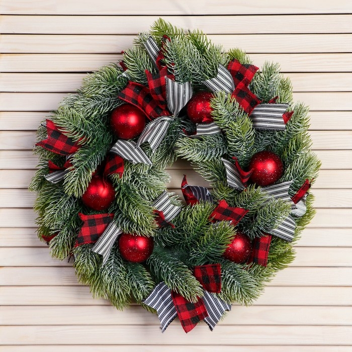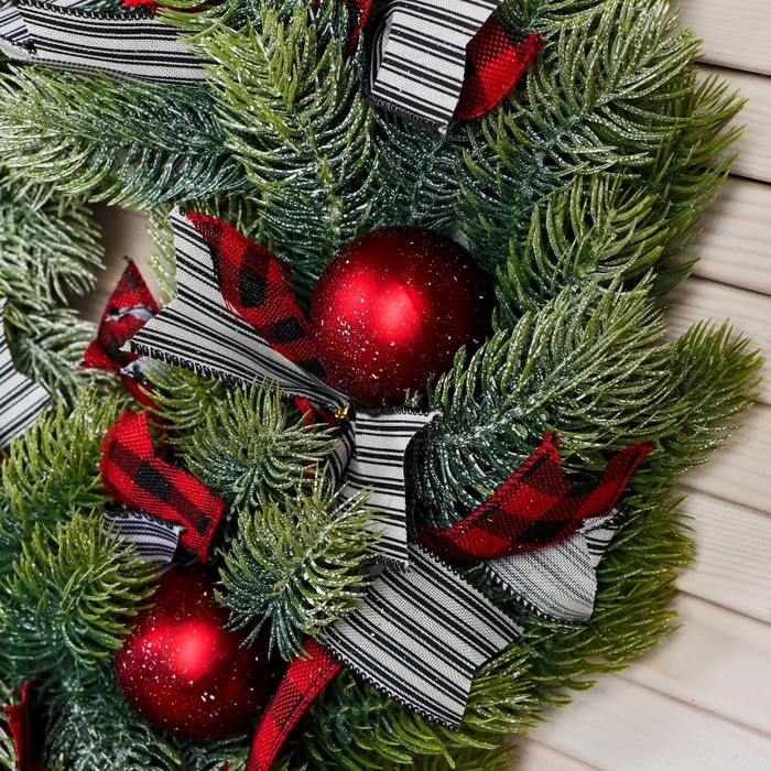 Венок новогодний d- 36 см "Уютная сказка" клетчатые ленты алые шары
