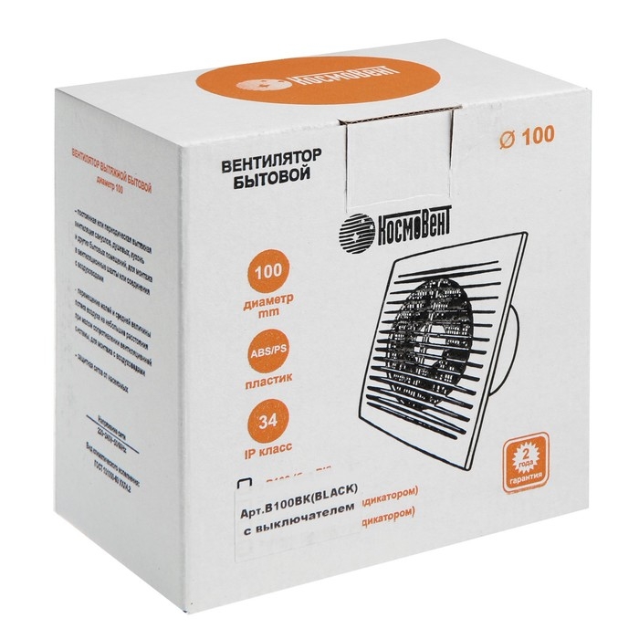 Вентилятор вытяжной "КосмоВент" В100ВК, d=100 мм, 10 Вт, 40 дБ, 105 м³/ч, с выключ., черный