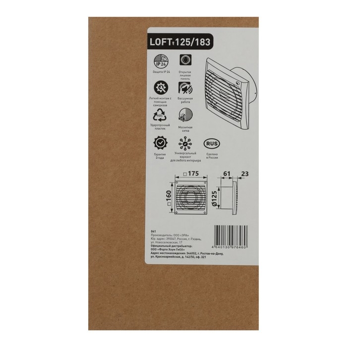 Вентилятор вытяжной Oasis Loft 125/183, d=125 мм, 16 Вт, 36 дБ, 183 м³/ч