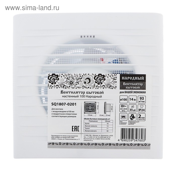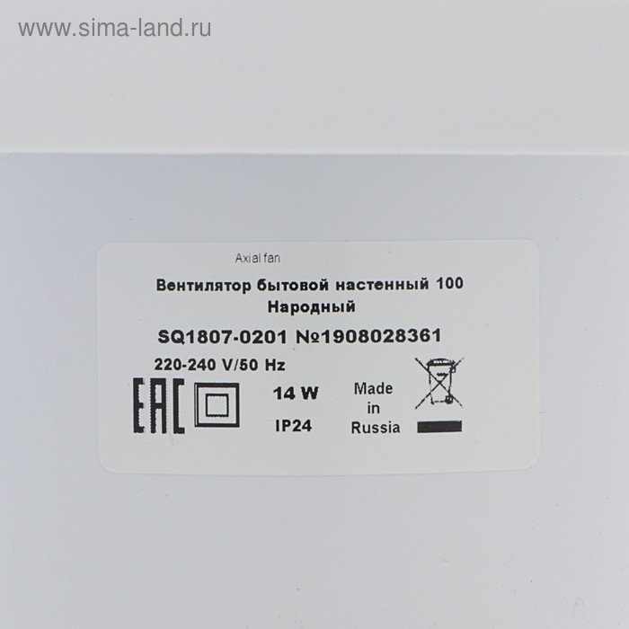 Вентилятор вытяжной TDM "Народный 100" SQ1807-0201, 230 В, настенный, d=100 мм, белый