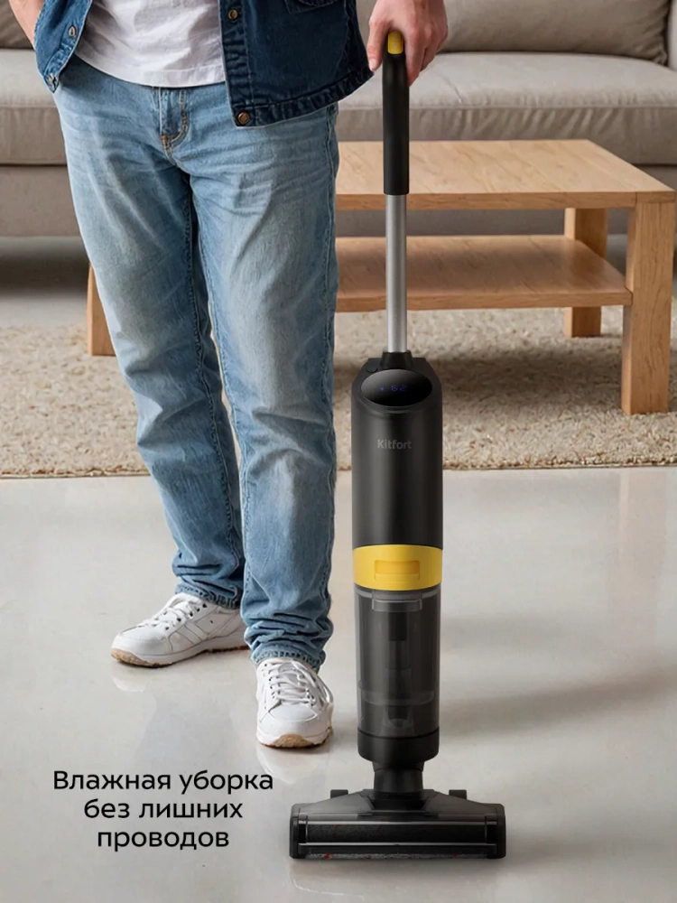 Беспроводной вертикальный моющий пылесос Kitfort КТ-5258 очень удобен при проведении влажной и сухой уборки. Благодаря работе от аккумулятора во время использования пылесос не нужно включать в сеть и провод не будет мешать под ногами.