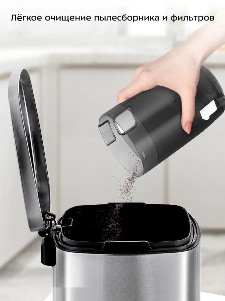Благодаря работе от аккумулятора пылесос имеет неограниченный радиус действия: от любого уголка квартиры до машины или беседки в саду.