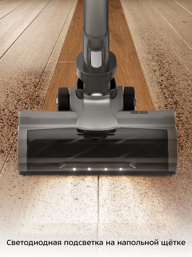 Пылесос комплектуется турбощеткой, которая качественно очищает гладкие поверхности и ковровые покрытия с коротким ворсом. Светодиодная подсветка на турбощетке позволяет увидеть пыль и мусор в плохо освещенных зонах, например под кроватью или диваном. К пылесосу прилагаются ворсовая щетка и узкая насадка.