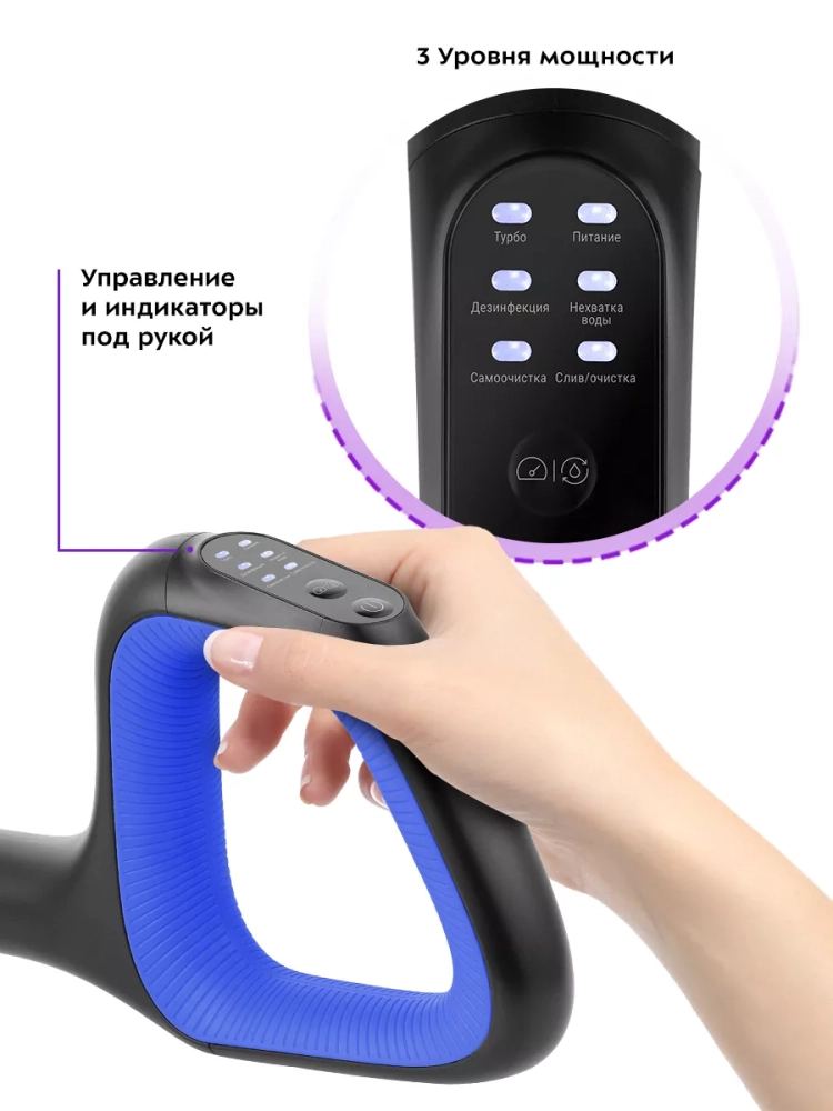 Моющий пылесос оснащен функцией самоочистки, что очень удобно и экономит время. Резервуары для чистой и грязной воды, фильтры и валик турбощетки легко снимаются и очищаются. В комплекте также идет ершик для очистки. Удлинительная ручка съемная, поэтому прибор можно разобрать для компактного хранения.