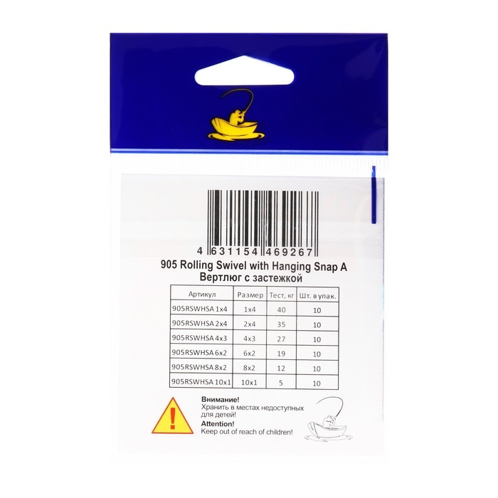 Вертлюг с застежкой Волжанка 905 Rolling Swivel with Hanging Snap A № 8х2, тест 12 кг, 5 шт