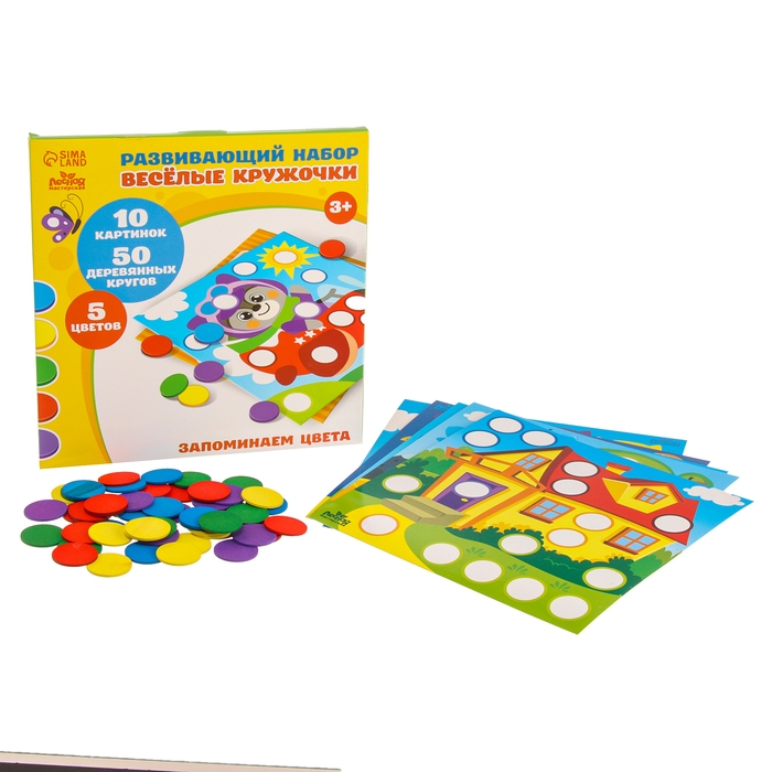 Развивающий набор "Весёлые кружочки. Запоминаем цвета" - 10 ярких картинок, 50 деревянных кругов, 5 основных цветов для игры и обучения!