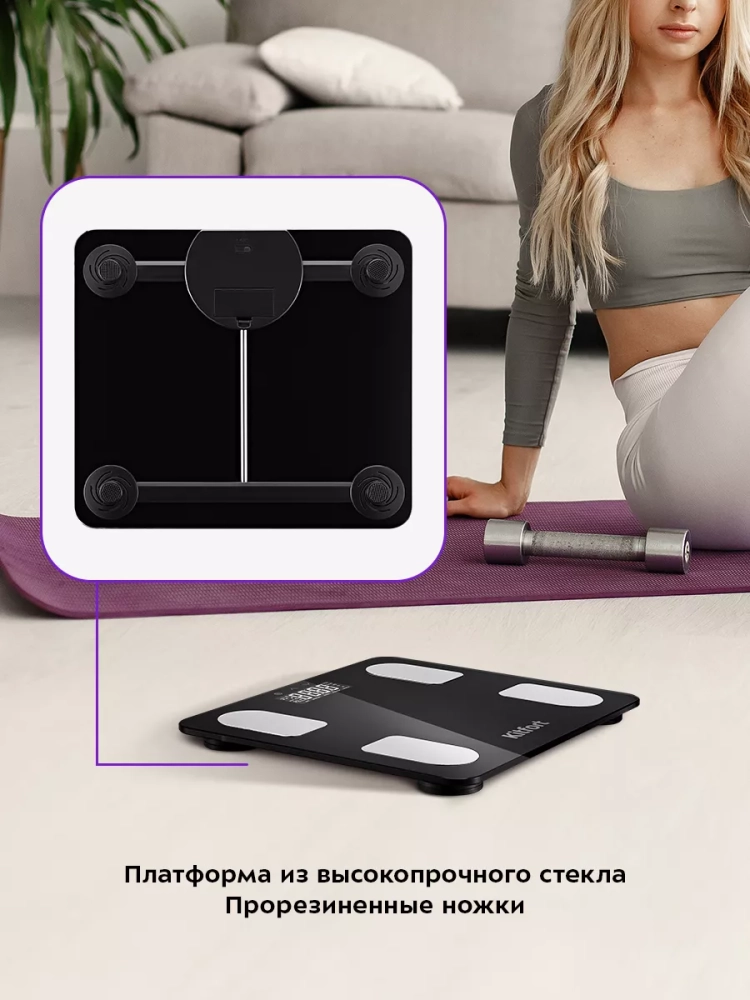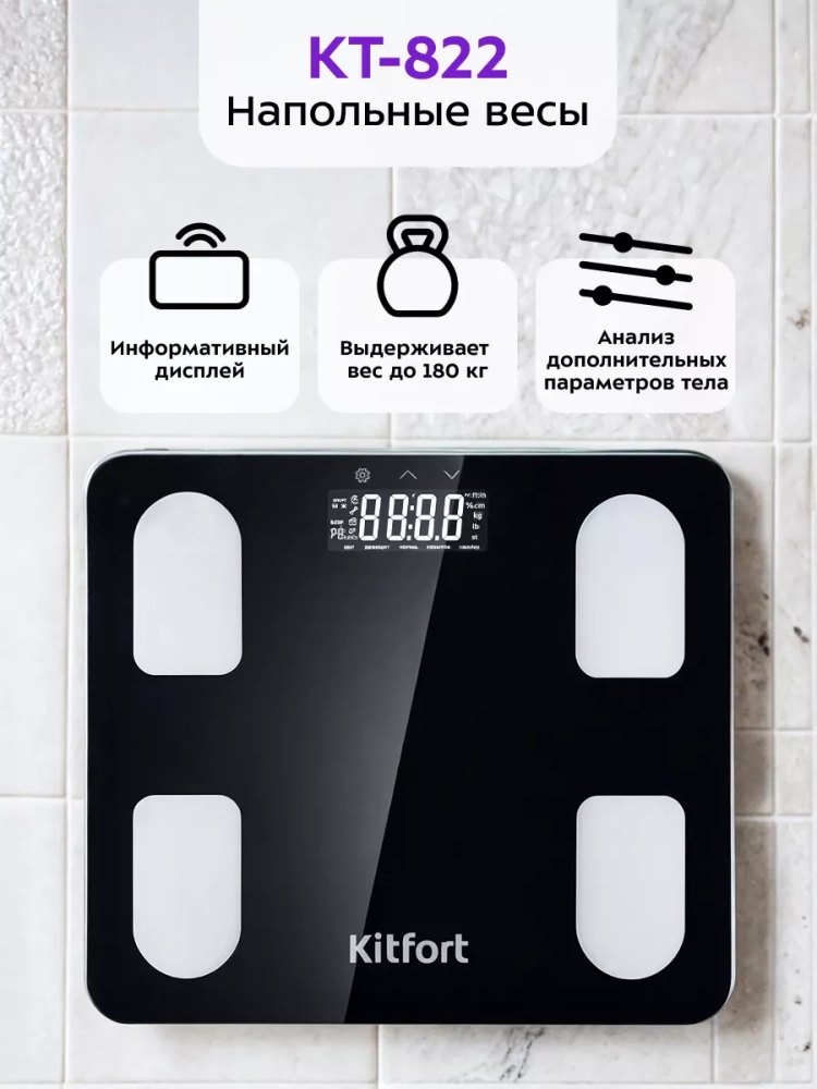Электронные напольные весы обеспечивают высокую точность измерения, что очень важно людям, следящим за своим весом. Весы Kitfort КТ-822 представляют современное поколение «умных» весов, поскольку выводят на дисплей разные параметры биоимпедансного анализа: вес, индекс массы тела, мышечную массу, костную массу, процентное содержание воды и жира в организме и скорость обмена веществ.