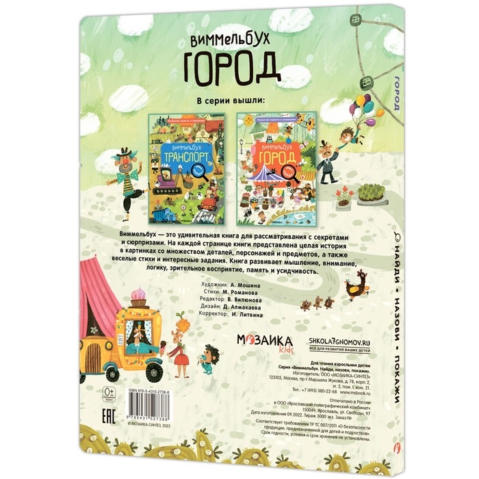 Виммельбух «Город» — это книга для рассматривания с красочными забавными иллюстрациями, секретами и сюрпризами. На каждой странице представлена целая история в картинках со множеством интересных деталей, персонажей и предметов, а также весёлые стихи и задания на поиск фрагментов картинки. Ребенок совершит увлекательную прогулку по городу: улицам, площадям и скверам; побывает в парке развлечений, на детской площадке, в аэропорту. Книгу можно рассматривать бесконечно — и находить что-то новое и неожиданное. Книга развивает мышление, внимание, логику, зрительное восприятие, память и усидчивость.