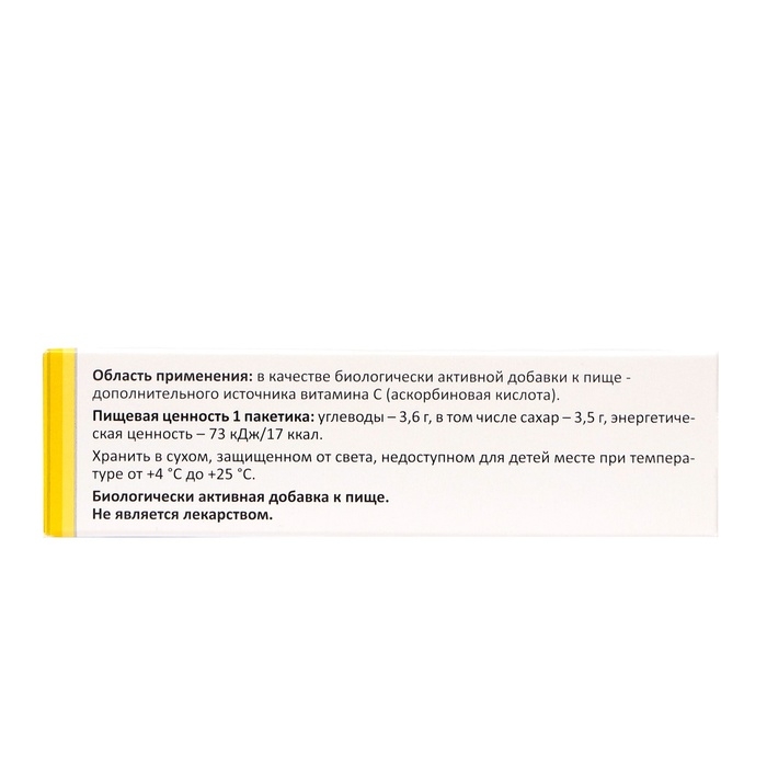 Состав: сахар, лимонная кислота; гидрокарбонат натрия (регулятор кислотности); L-аскорбиновая кислота (витамин С); крахмал картофельный; ароматизатор пищевой; цикламат натрия (подсластитель); сахарин натрия (подсластитель); рибофлавин 5’-фосфат натрия (краситель).