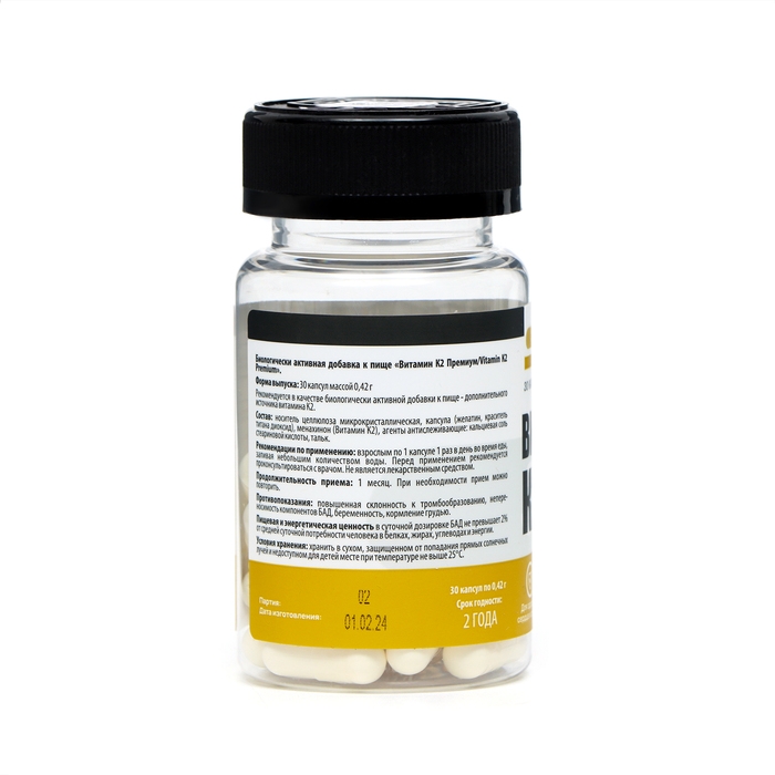 Каждая капсула содержит 100 мкг витамина K2 (в форме МК-7), что является рекомендуемой суточной дозой для взрослых. Витамин K2 Премиум производится в соответствии с высокими стандартами качества и безопасен для употребления.