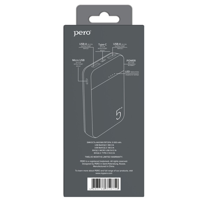 Внешний аккумулятор PERO PB01, 5000 мАч, 2 USB, 2.1 А, индикатор, черный