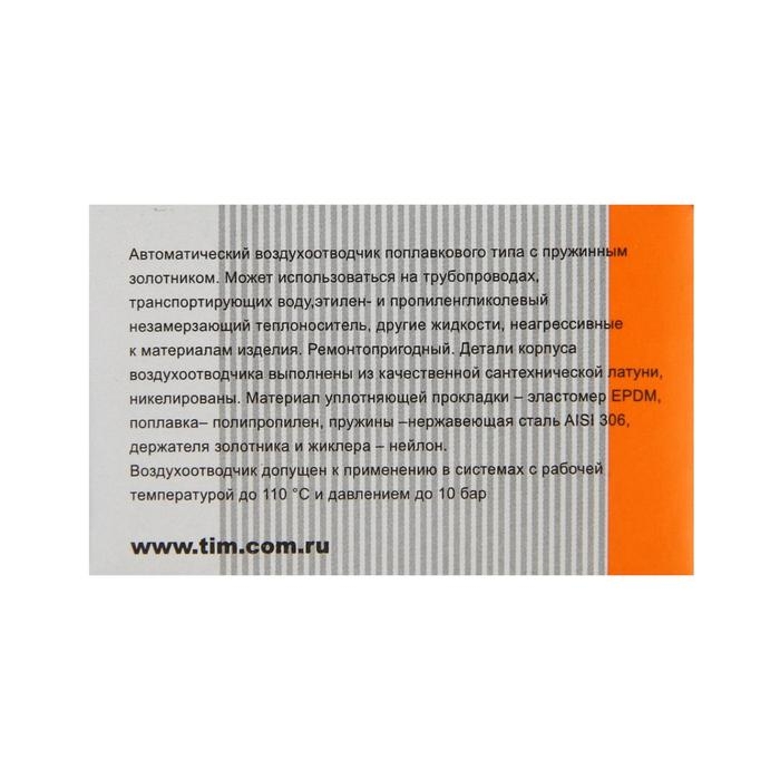 Воздухоотводчик автоматический TIM BL5818, 1/2", с отсечным клапаном