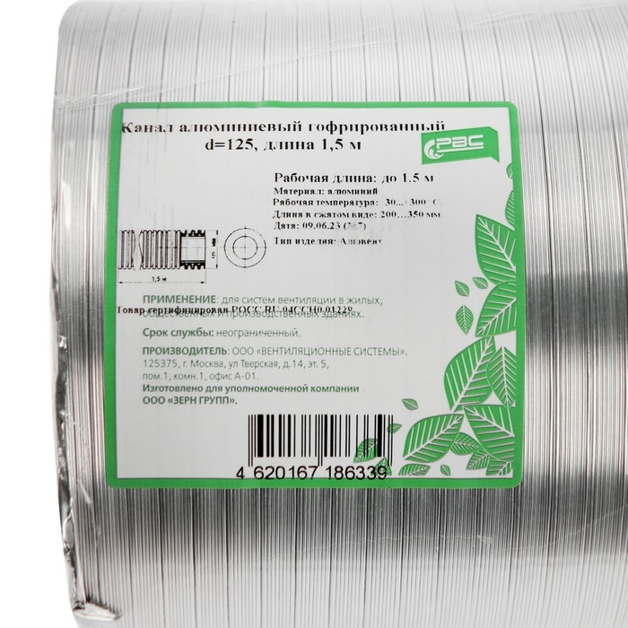 Воздуховод гофрированный "Алювент", d=125 мм, раздвижной до 1.5 м, алюминиевый