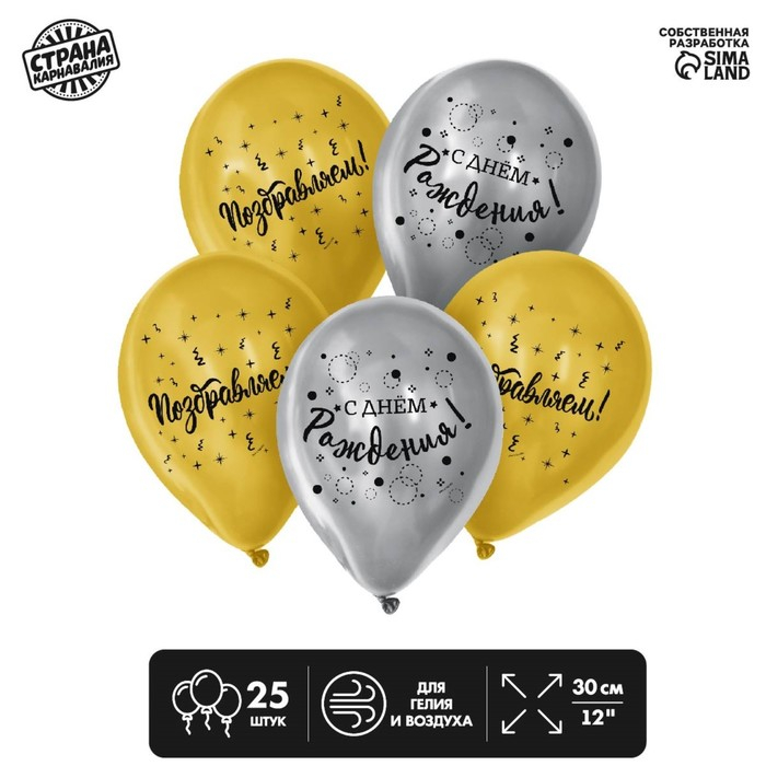 Воздушный шар латексный 12" «С днём рождения», поздравляем, 25 шт.