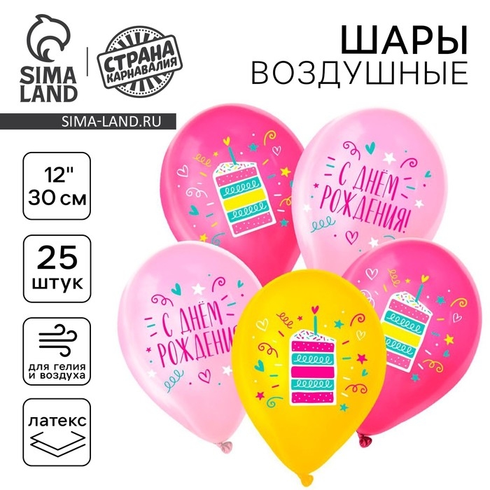 Воздушный шар латексный 12" «С днём рождения. Торт», 25 шт.