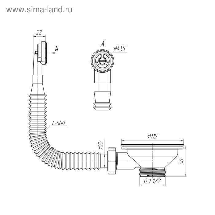 Выполнен с нержавеющей решёткой диаметром 115 мм и круглым гибким вертикальным переливом.