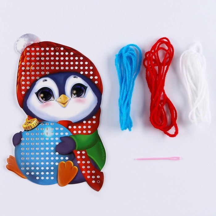 Вышивка пряжей на новый год «Пингвин с шариком» на картоне, новогодний набор для творчества