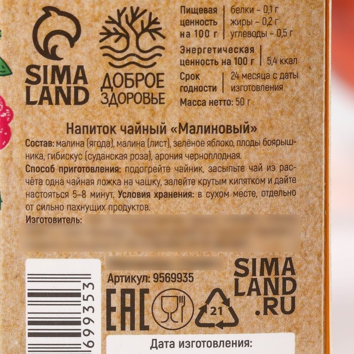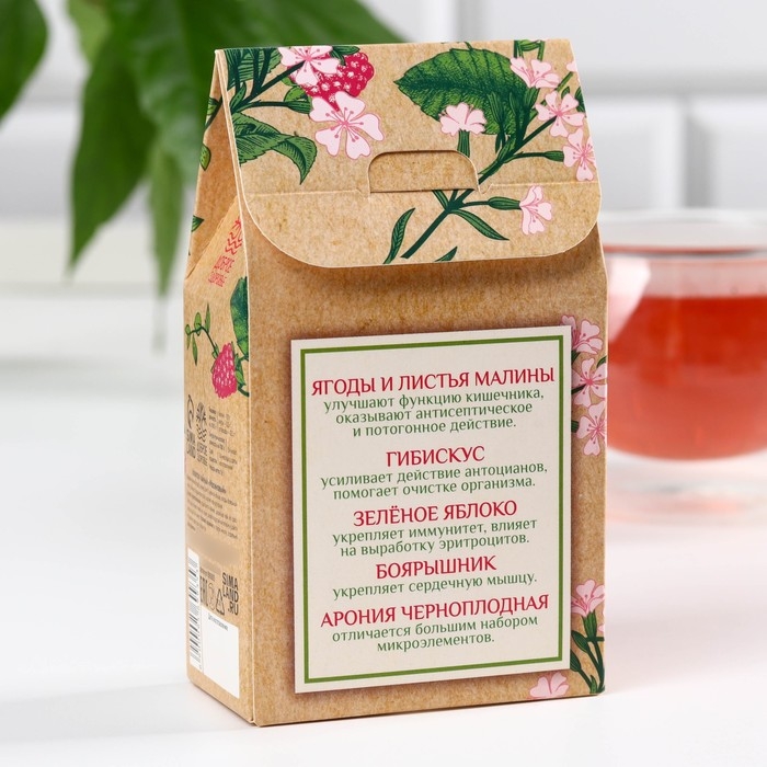 Состав: малина (ягода), малина (лист), зелёное яблоко, плоды боярышника, гибискус (суданская роза), арония черноплодная.