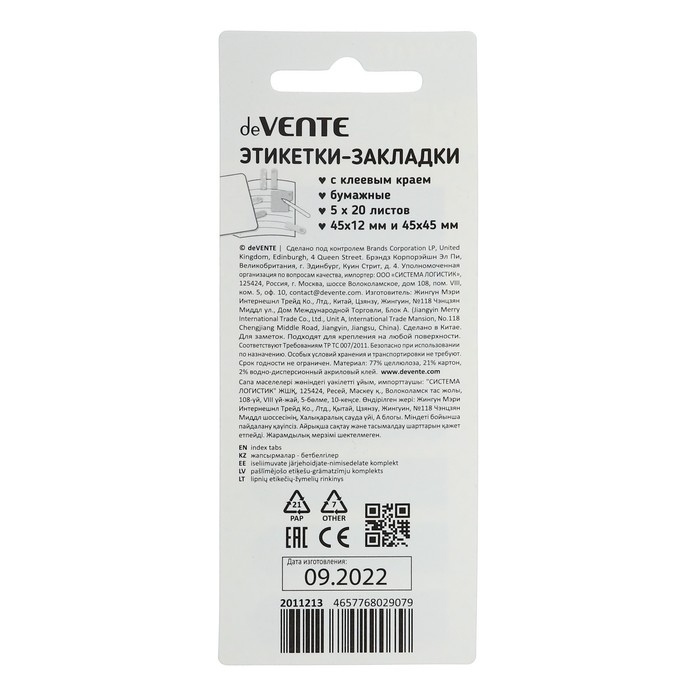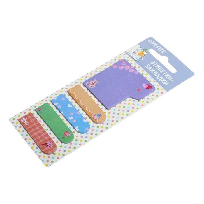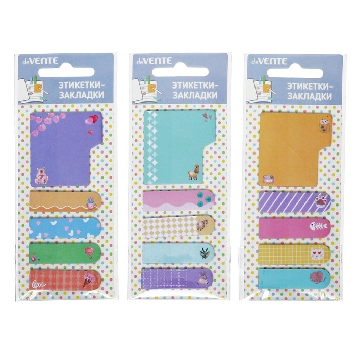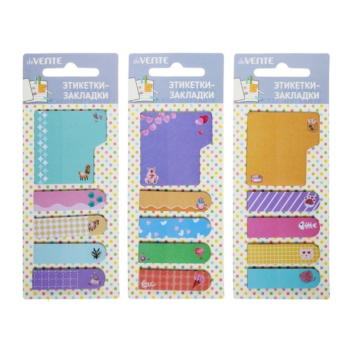 Набор самоклеящихся этикеток-закладок deVENTE. Funny Animals бумажные 45 x 12 мм и 45 x 45 мм, 20 листов, офсет 80 г/м2, печать 4+0, ассорти форм, 5 дизайнов, в картонном блистере и пластиковом пакете с европодвесом.
