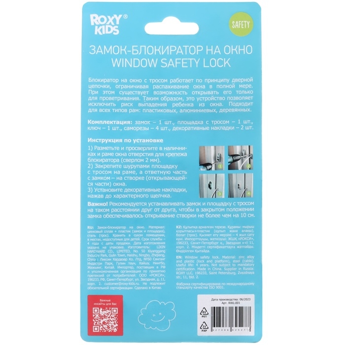 Замок на окно с тросом ROXY-KIDS препятствует широкому открыванию створки окна и убережет вашего малыша от падения с высоты. Он работает по принципу дверной цепочки, ограничивая распахивание в полной мере. При этом существует возможность открывать окно только для проветривания. Помимо своей основной функции, оберегает от падения домашних животных и защищает дом от проникновения грабителей. Очень надежная защита, поскольку блокиратор крепится непосредственного к раме на саморезы и его не снять без специальных приспособлений. Открыть замок можно только с помощью ключа. Трос выдерживает нагрузку до 500 кг, разорвать его руками невозможно. Блокиратор ограничивает ширину и фиксирует угол открывания створки, можно подобрать наиболее безопасный вариант. Подходит для всех типов рам. Универсальный белый цвет незаметен на большинстве окон. Процесс установки занимает считанные минуты.