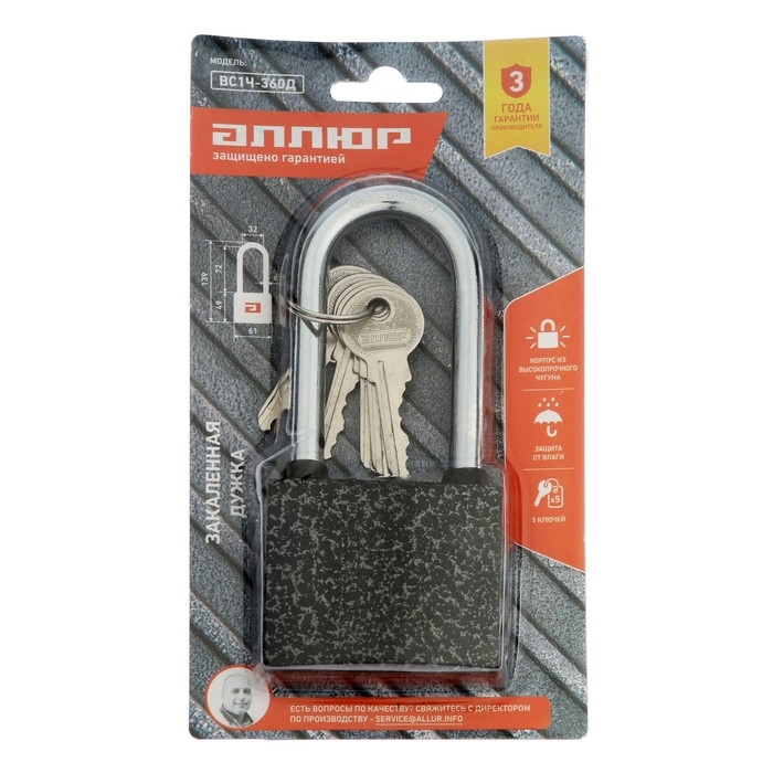 Замок навесной "АЛЛЮР" ВС1Ч-360Д, длинная дужка d=9 мм, 5 ключей