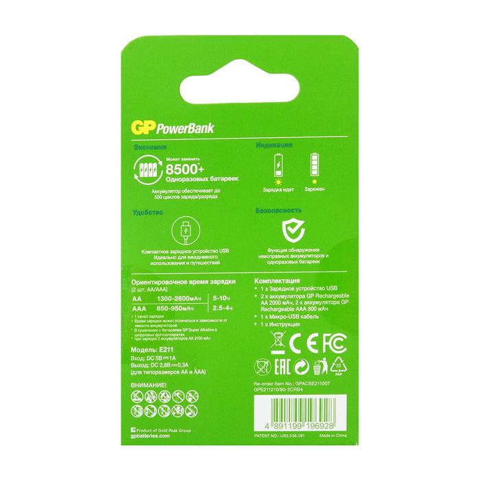 Зарядное устройство GP E211 + 4 аккумулятора AA/AAA 2100/800 мАч, белое