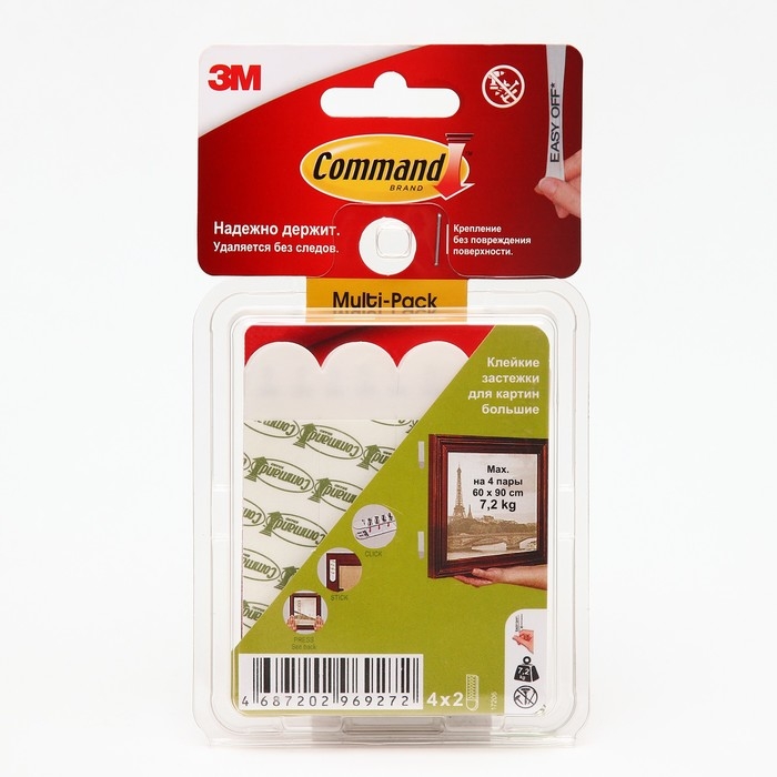 Застежки самоклеящиеся Command для картин, белые, большие, 4 пары