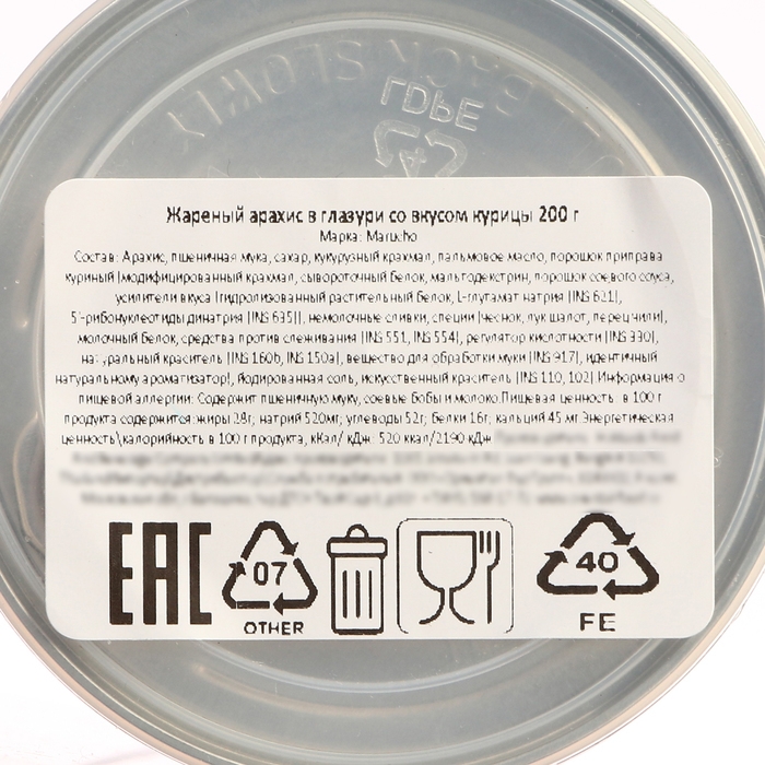 Жареный арахис со вкусом курицы в нежной хрустящей глазури производится тайской компанией Marucho. Натуральный арахис высокого качества покрывают нежной хрустящей глазурью со вкусом курицы. Глазурь изготовлена из пшеничной муки, крахмала, сахара и соли с добавлением куриного порошка. Такой арахис — это не только вкусный, но и питательный перекус.