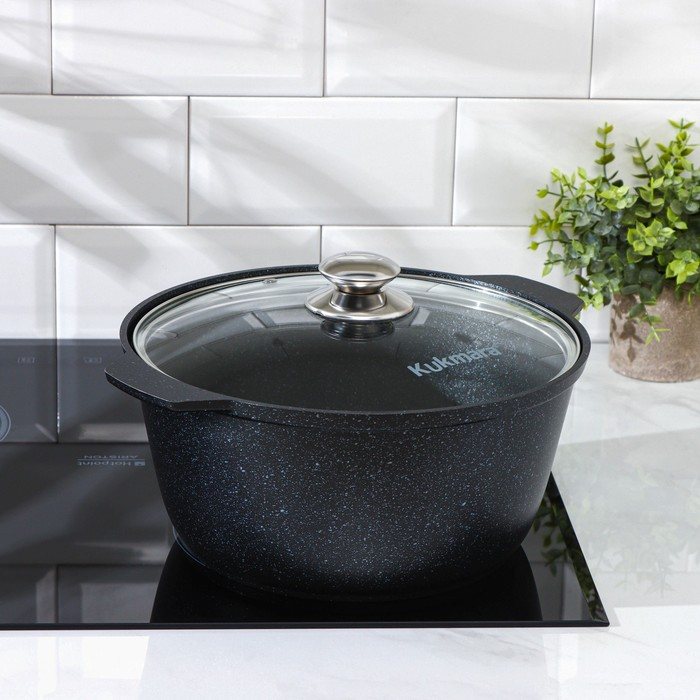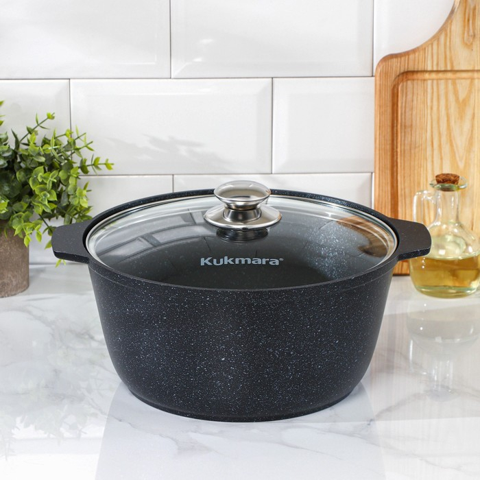 Кастрюля-жаровня Kukmara сделана из литого алюминия. Имеет инновационное антипригарное мраморное покрытие на водной основе, которое изготовлено по немецкой технологии (Weilburger Coatings GmbH) и усилено сверхтвёрдыми частицами минералов.