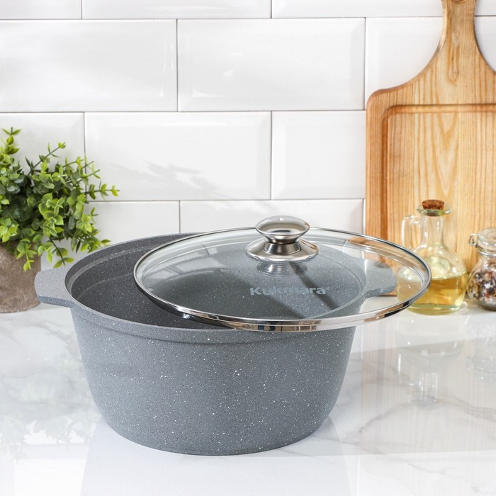 Кастрюля-жаровня Kukmara сделана из литого алюминия. Имеет инновационное антипригарное мраморное покрытие на водной основе, которое изготовлено по немецкой технологии (Weilburger Coatings GmbH) и усилено сверхтвёрдыми частицами минералов.