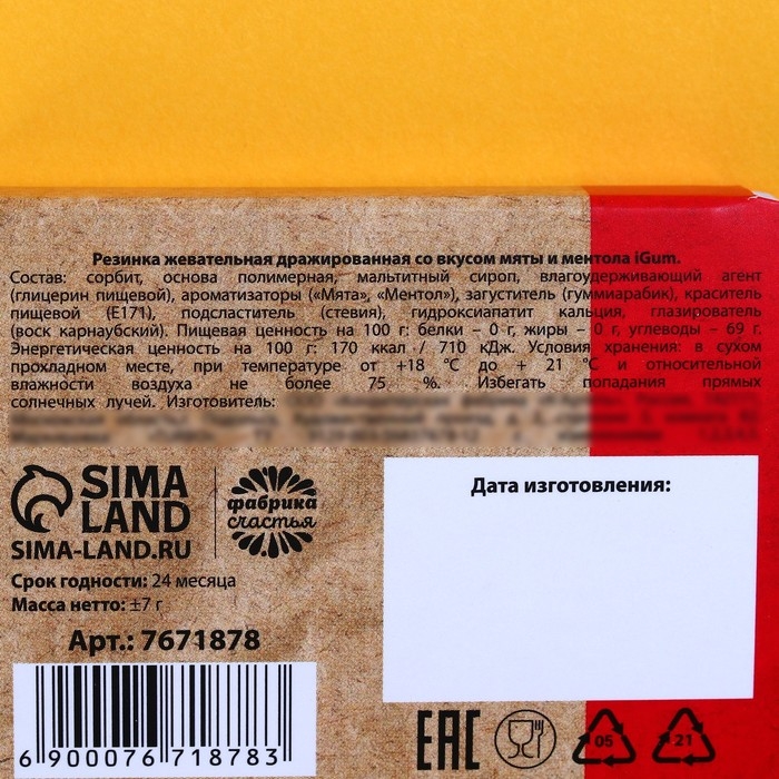 Состав: сахар – 35 %, глюкоза – 15 %, сироп глюкозы – 20 %, основа для жевательной резины – 24 %, гуммиарабик – 1,69 %, лимонная кислота – 1 %, аспартам – 0,5 %, лецитин – 0,5 %, глицерин – 0,5 %, искусственный ароматизатор (мята) – 1,5%, карнаубский воск – 0,3 %, искусственные красители (E133, E171, E129, E102) – 0,01 %.