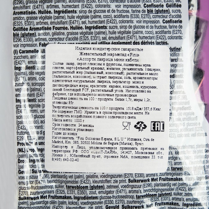 Фруктовый жевательный мармелад с натуральным соком, ассорти лакрица мини кабели. Мармелад без вредных компонентов; искусственных красителей; ароматизаторов. Мармелад содержит полностью натуральные компоненты позволяют создать отличные вкусовые качества и не вредят организму.