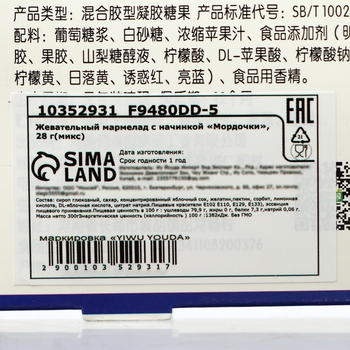 Жевательный мармелад с начинкой "Мордочки" — это веселое и яркое угощение, которое подарит вам и вашим близким море радости и улыбок! Каждая мармеладка весом 28 грамм содержит очаровательный микс мармелада в виде ярких глаз. Сочетание мягкой жевательной текстуры и вкусной начинки сделает каждое угощение необычным. Каждый кусочек — это не просто сладость, а настоящее праздничное настроение, полное веселья и позитива. Яркие цвета и забавные мордочки на упаковке создают атмосферу беззаботности, привлекая внимание как детей, так и взрослых.