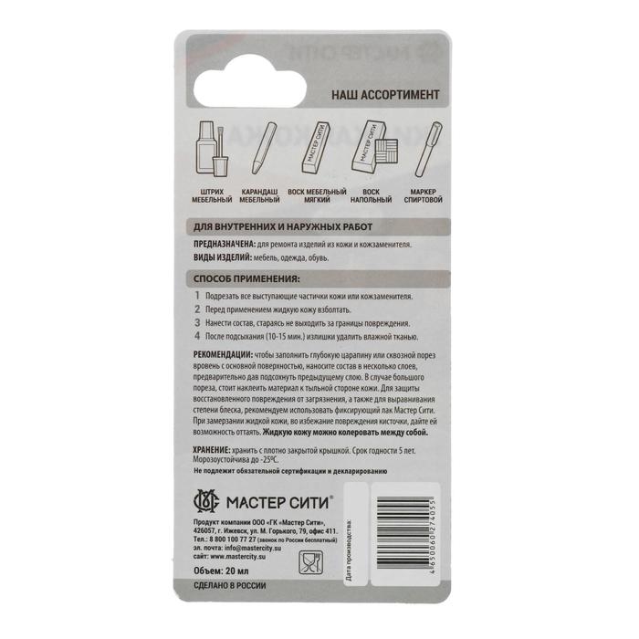 Профессиональный восстановитель кожи, известный под названием "жидкая кожа" известнейшего производителя профессиональной косметики Мастер Сити. Предназначен для восстановления поврежденного лицевого слоя всех видов кож. Используется только для небольшого участка поврежденной кожи.