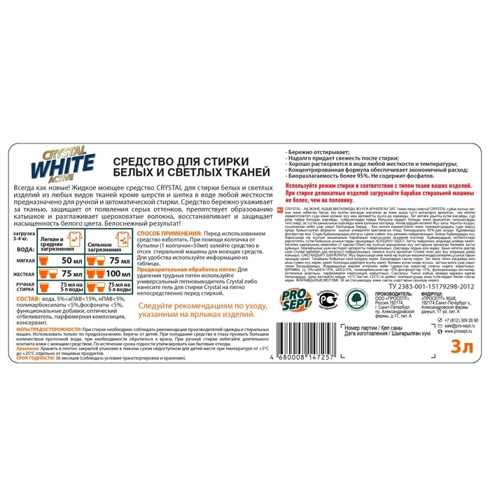 Жидкое моющее средство Crystal White предназначено для стирки белых и светлых изделий из любых тканей, кроме шерсти и шелка.