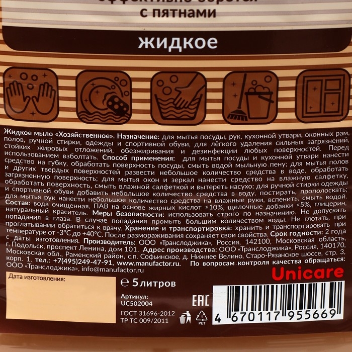 Жидкое мыло "Хозяйственное" универсальное UNICARE, ПЭТ, 5 л