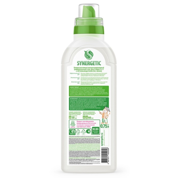 Биоразлагаемый концентрированный гель для стирки 2 в 1 c пятновыводителем SYNERGETIC предназначен для использования в стиральных машинах любого типа, ручной стирки при температуре 15 - 90 °C, а также для предварительной обработки пятен.