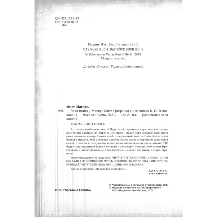 Это очень необычная книга! Ведь на её страницах спрятаны настоящие магические заклинания, парочка монстров и целое море загадок! Злая книга ищет читателя, который готов пройти запутанный квест и стать обладателем Чёрного амулета. Этот артефакт наделит своего хозяина огромной волшебной силой. И кажется, следующим всемогущим магом можешь стать именно ТЫ! Ведь ты не трусливый зайка и точно не испугаешься историй Злой книги. Приготовься к захватывающему приключению и скорее открывай первую страницу!